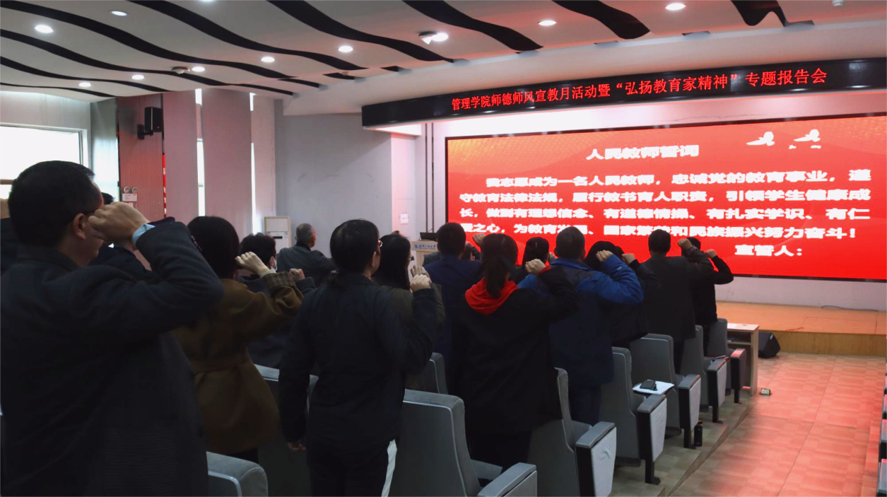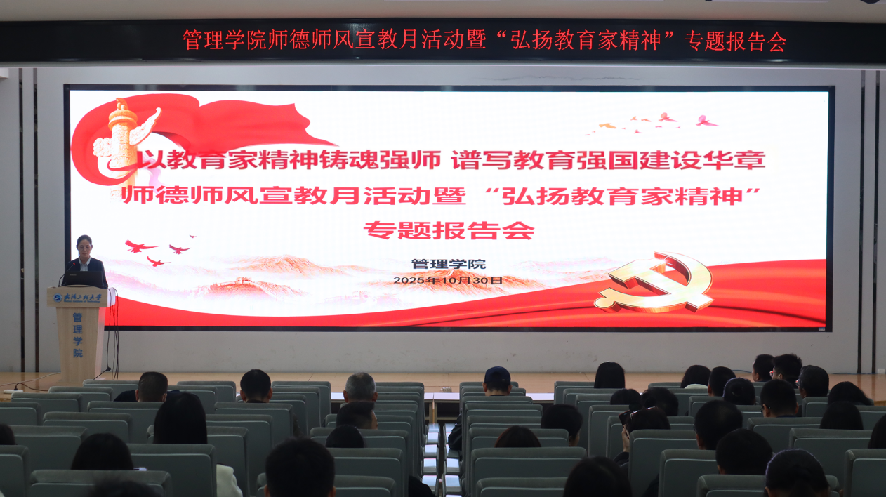 (通讯员 李梓煜)为深入贯彻落实习近平总书记在党的二十届四中全会和全国教育大会上的重要讲话精神,全面落细《中共中央 国务院关于弘扬教育家精神加强新时代高素质专业化教师队伍建设的意见》部署要求,切实推进学院新时代高素质专业化教师队伍建设,10月30日下午学院在文科楼413报告厅举办师德师风宣教月活动暨“弘扬教育家精神”专题报告会,学院领导班子成员、全体教职工参会,会议由管理学院党委书记左辉主持。