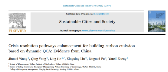 (通讯员 于怡迪)近日,我院青年教师汪金美在国际权威期刊《Sustainable Cities and Society》上,发表题为 Crisis resolution pathways enhancement for building carbon emission based on dynamic QCA: Evidence from China 的学术论文。《Sustainable Cities and Society》(SCS)是全球城市可持续发展研究领域的顶尖期刊,由国际知名出版机构Elsevier发行,长期引领城市、交通、能源、环境等多学科交叉的前沿研究。该期刊系SCI检索期刊,JCR一区、中科院一区TOP期刊,影响因子高达10.5,在全球同类期刊中名列前茅。