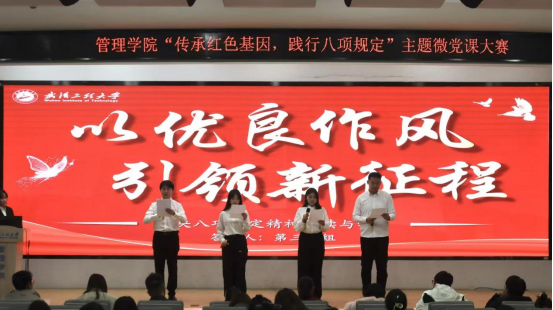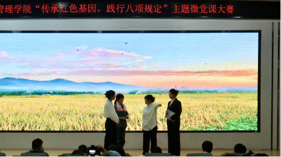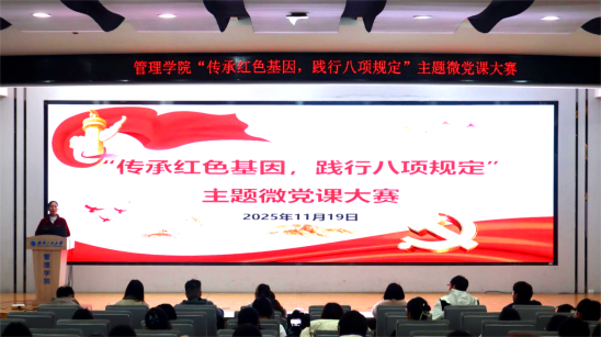 (通讯员 李梓煜)为巩固拓展深入贯彻中央八项规定精神学习教育成效,引导青年学子从红色基因中汲取奋进力量,将优良作风内化于心、外化于行,11月19日下午,管理学院在文科楼413报告厅举办“传承红色基因,践行八项规定”主题微党课大赛。学院党委书记左辉、副书记罗琼、各党支部书记、学生党员代表、第18期发展对象培训班全体学员参加活动。