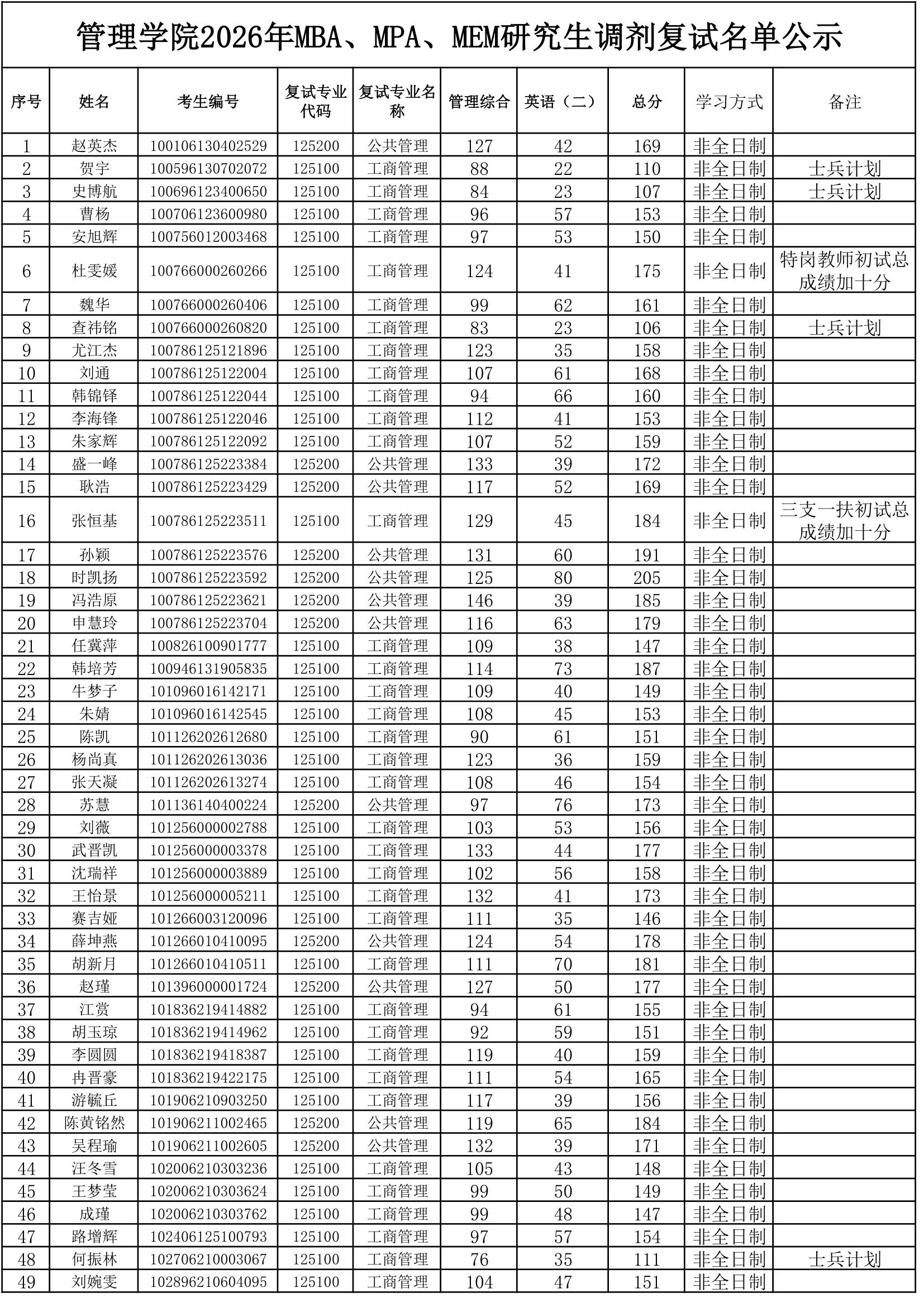 管理学院2026年MBA、MPA、MEM研究生调剂复试名单公示