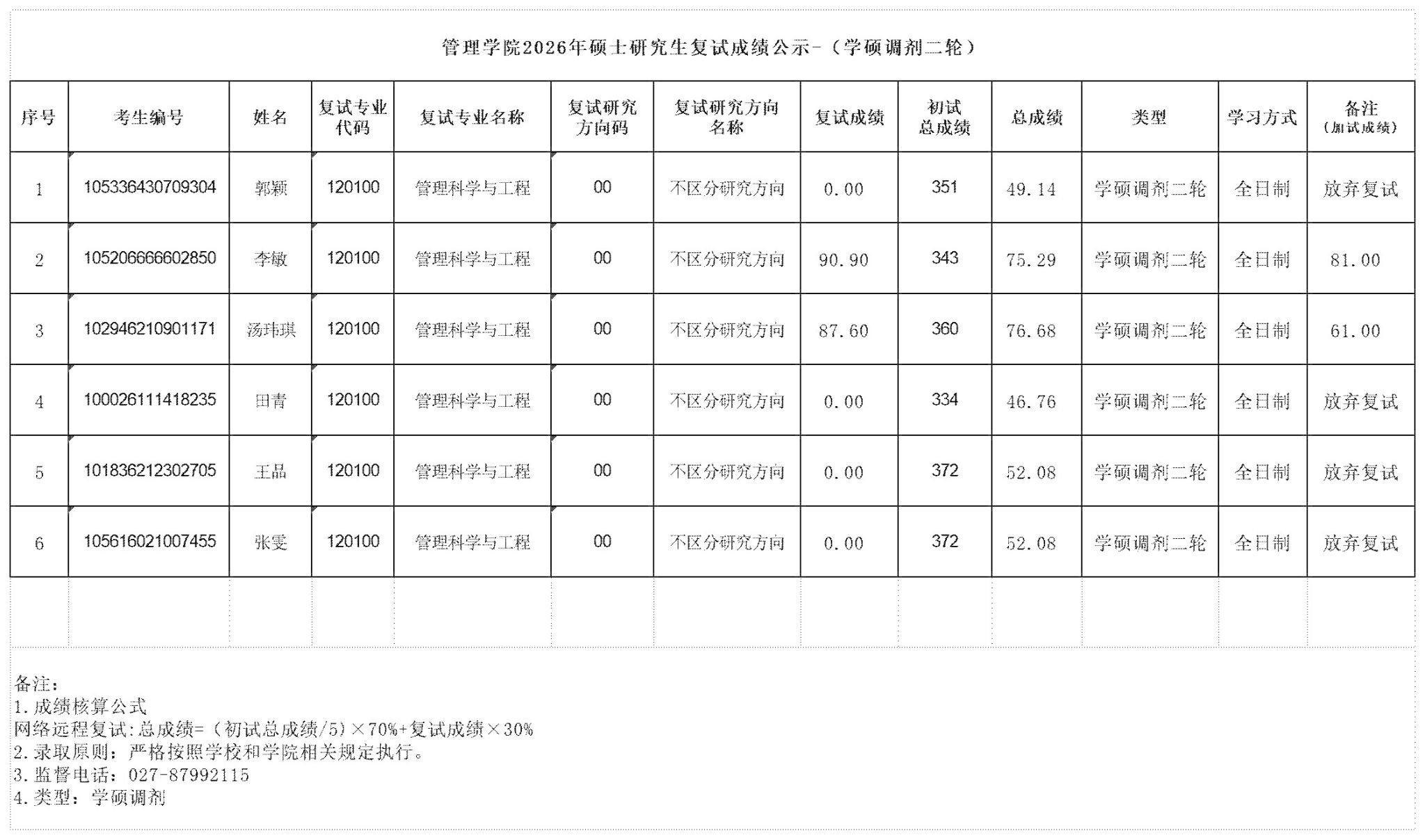 管理学院2026年硕士研究生复试成绩公示-(学硕调剂二轮)